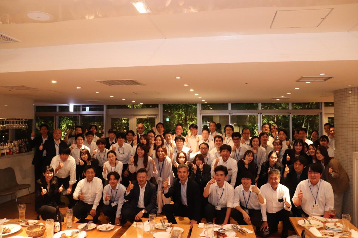 半期に⼀度、事業計画発表会・キックオフを実施し、半期の業績と次期に向けた計画を社員で共有します。懇親会ではリラックスした雰囲気で社員同⼠の交流を深めています。